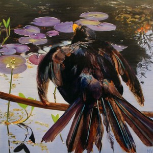 Vogels en kikkers bezoeken onze vijver. Ik heb ze weergegeven in olieverf op kleine paneeltjes van multiplex. In tegenstelling tot mijn andere werk, is de verf dun en transparant opgezet, waardoor het wit van de ondergrond een belangrijke rol speelt.